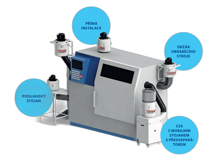- Multifunkční držák určený k přímé instalaci na obráběcí stroje, vhodný zejména tam, kde jsou náklady na zařízení vysoké. Při všech instalacích se zohledňuje poloha, použití, snadnost následné údržby a velikost sběrače olejové mlhy. Pro sběrače olejové mlhy řady TWS a TWFX jsou k dispozici držáky pro obráběcí stroje.